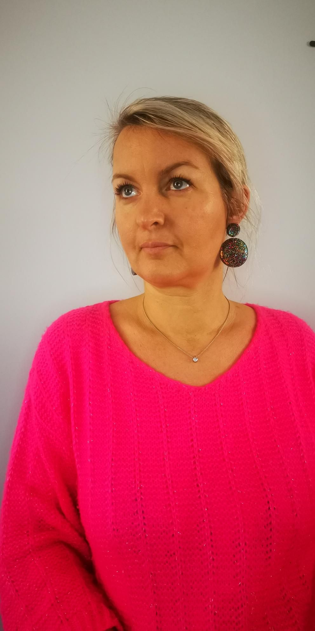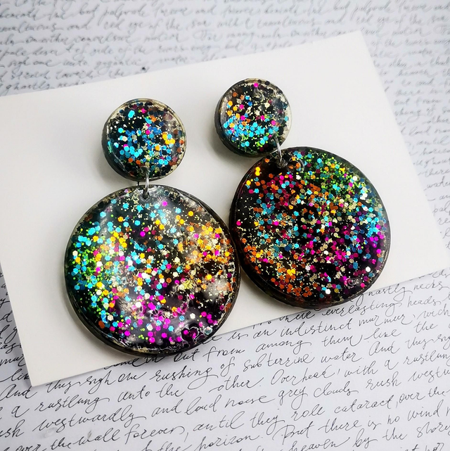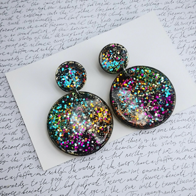 Boucles d'oreilles MIG'S, Hauteur: 5,5cm Largeur 4cm. Oreilles percées. Clou en acier inoxydable. Baaméria multicolore sur fond noir . Poids 4 grammes