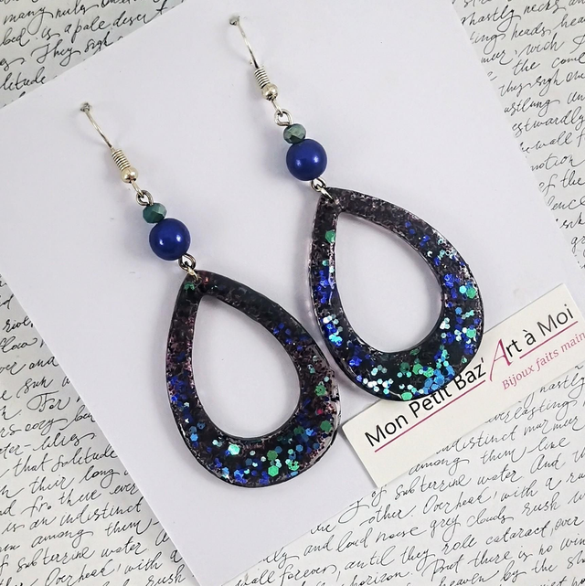 Boucles d'oreilles Gouttes V4 , hauteur 8,5 cm / largeur 3cm. Oreilles percées. Baaméria noir glaçage bleu vert. Poids 3grammes