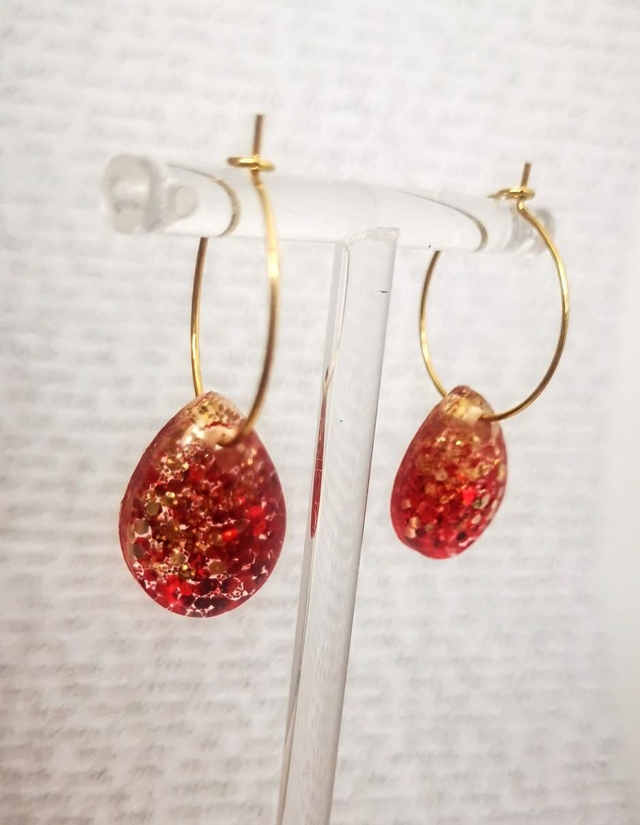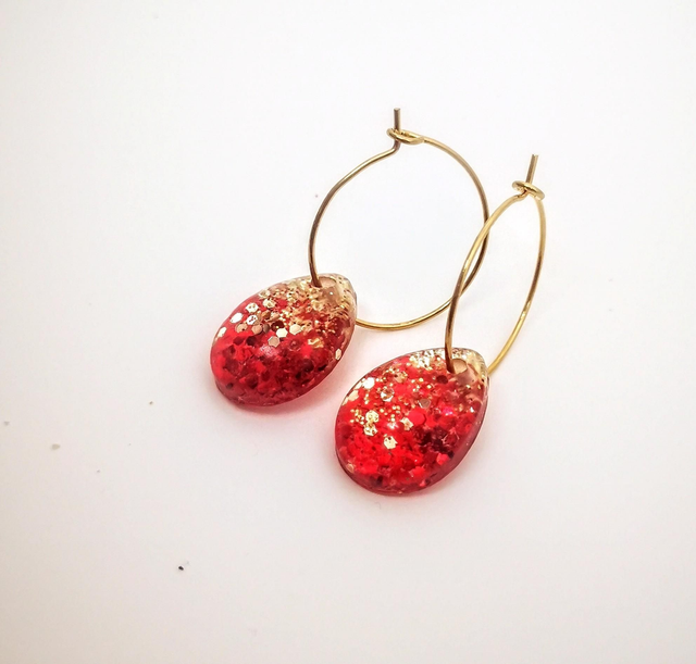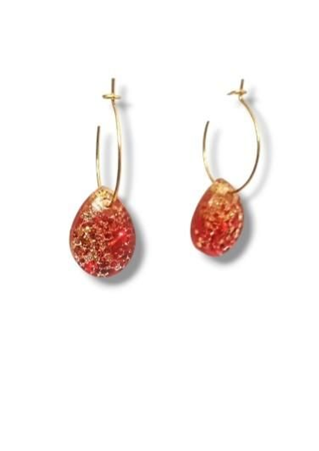 Boucles d'oreilles créoles acier gouttes bombées. auteur 3.5 cm / largeur 1,3 cm. Acier inoxydable doré . Oreilles percées.. Baaméria rouge doré . Poids inférieur à 1 gramme