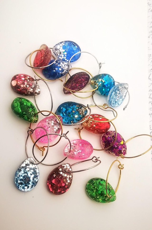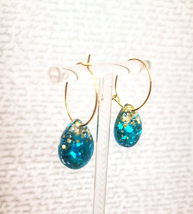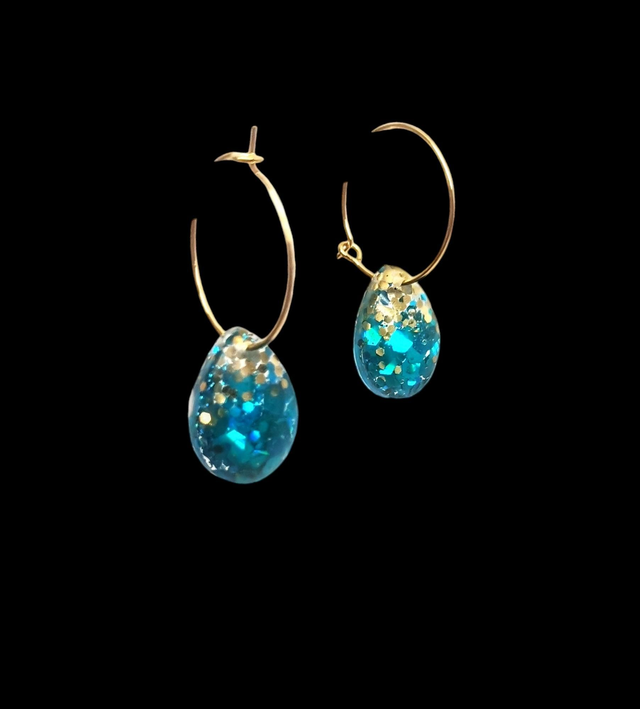 Boucles d'oreilles créoles acier gouttes bombées. auteur 3.5 cm / largeur 1,3 cm. Acier inoxydable doré . Oreilles percées.. Baaméria bleu vert canard turquoise doré . Poids inférieur à 1 gramme